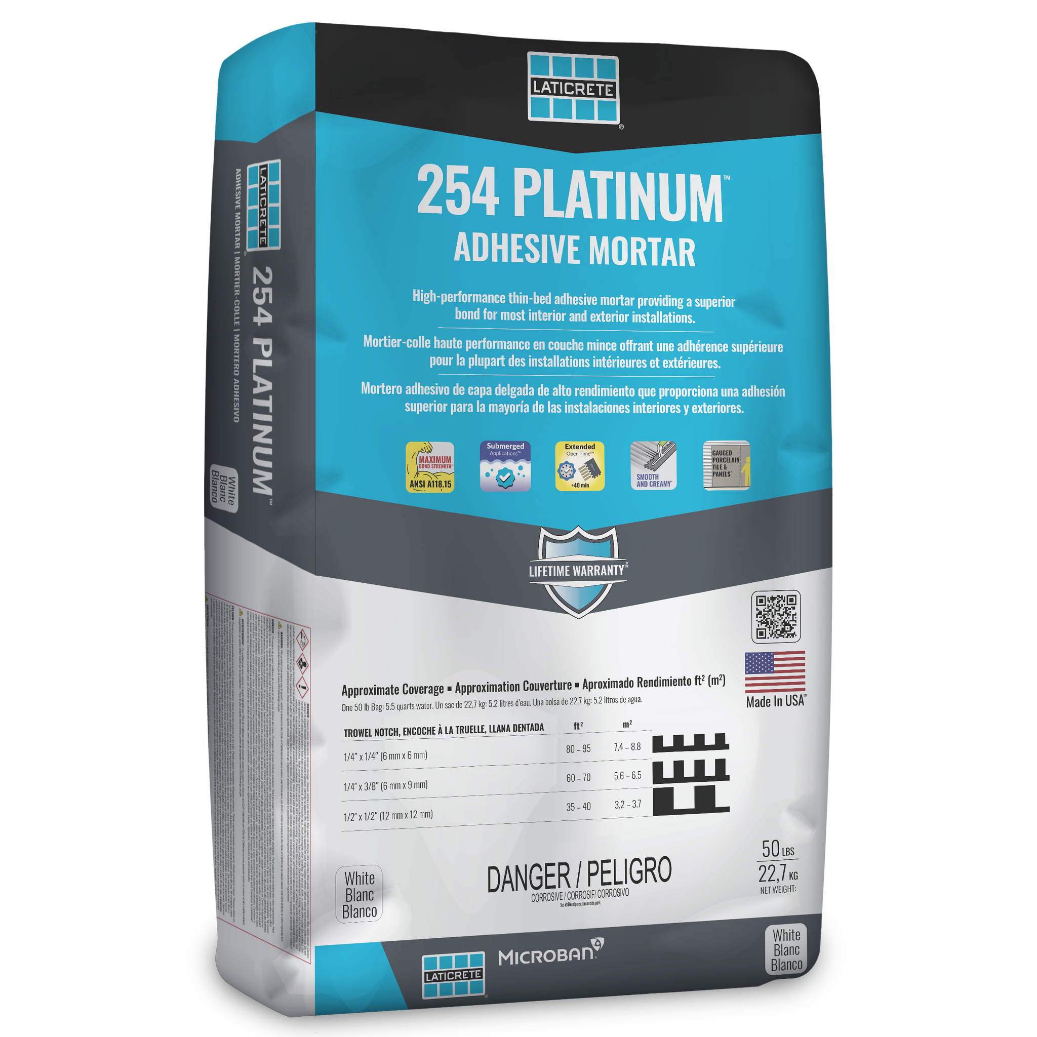 Le mortier-colle en une seule étape, renforcé aux polymères, pour la pose intérieure et extérieure de carreaux de céramique, de carreaux de porcelaine, de panneaux/dalles de carreaux de porcelaine calibrés (GPTP), de pierre, de carreaux de carrière, de pavés et de briques. 254 Platinum, conçu pour être mélangé simplement avec de l'eau, présente un long temps ouvert avec une adhérence et une maniabilité inégalées. 254 PLATINUM est un substitut approuvé par LATICRETE pour 211 Poudre mélangée avec 4237 Additif au latex .