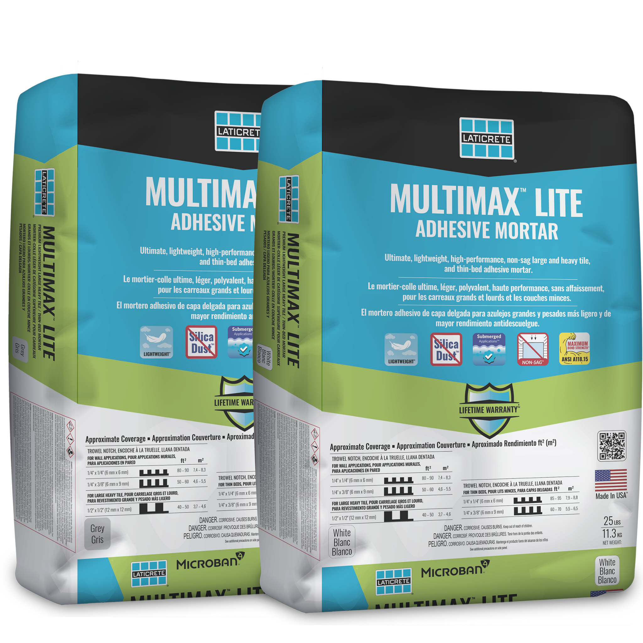 The ultimate, lightweight one-step, polymer fortified, Large and Heavy Tile mortar for interior and exterior installation of ceramic tile, porcelain tile, glass tile, stone, quarry tile, pavers and brick. MULTIMAX LITE features maximum non-sag performance on walls and maximum buildup of up to ¾" (19 mm) without shrinkage on floors. MULTIMAX LITE contains no respirable crystalline silica levels that exceed the OSHA action level*, and has a smooth, lightweight, easy-to-trowel consistency and a long open time for ease of installation. The robust formula is fiber-reinforced for maximum strength and durability, exceeding ANSI A118.15 requirements. MULTIMAX LITE utilizes LATICRETE HYDROMATIC CURE CHEMISTRY™. This technology accelerates the hydration process to rapidly consume the water in the system, allowing the material to cure in a predictable manner.